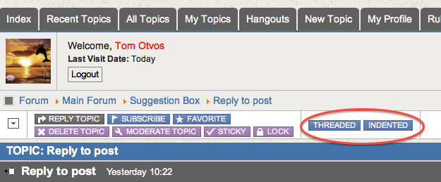 About the threading, Laurel, if you reply to a post up-thread your reply will show up at the point that you replied, just after the post you replied to. If you reply to the last post on a thread your reply will show up as the last post itself. The operative factor here is which post you reply to.