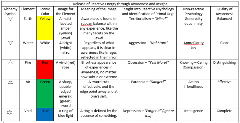 Disclaimer: I'm realizing that the way I talk about five elements is a bit of a hybrid between the Trungpa/AroTer teachings and Ken McLeods teachings. Trungpa/AroTer tend to emphasize the psychological domain (Earth is territorial when there is a fixation, Earth is generous when it is free). McLeod is more about visceral reactive patterns (rigidity when in the pattern, balanced yet without ground when free). To complicate it, Hokai has some ways of portraying it that are slightly different.... So what I'm trying to say is: take anything that works and use it, but there is a lot of variation in what is out there and sometimes what I say is inconsistent with the different flavors of the practice.